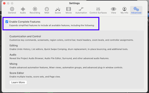 First, click on "Logic Pro -> Settings -> Advanced...". Activate "Enable Complete Features".