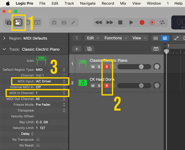 Then you have to "arm" the tracks of Logic. Please take a look at this image: